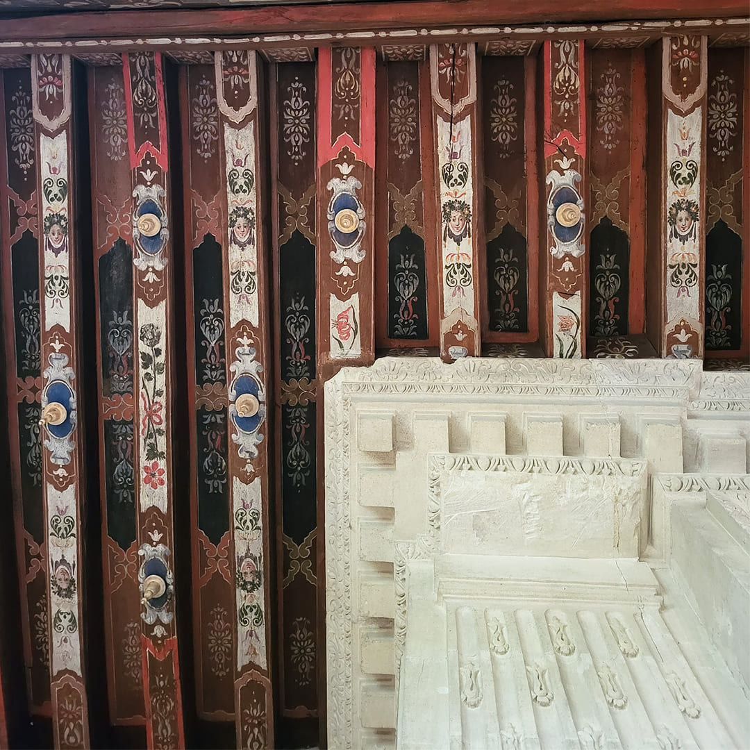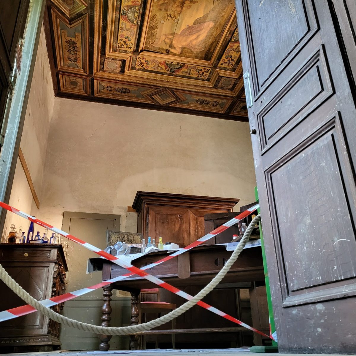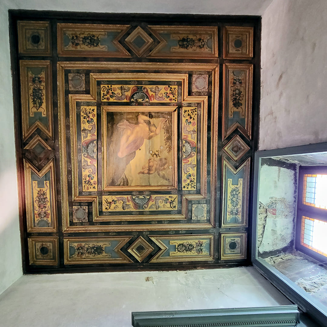 Les éléments d’enquêtes ne sont pas perturbants pour suivre l’histoire du château. Cela apporte même un petit quelque chose à certaines pièces et rend le château plus vivant. Si vous relevez la tête de temps en temps, vous découvrirez de magnifiques plafonds : motifs botaniques colorés, paysages à l’italienne, papiers mâchés, caissons à l’italienne, de quoi émerveiller le regard.