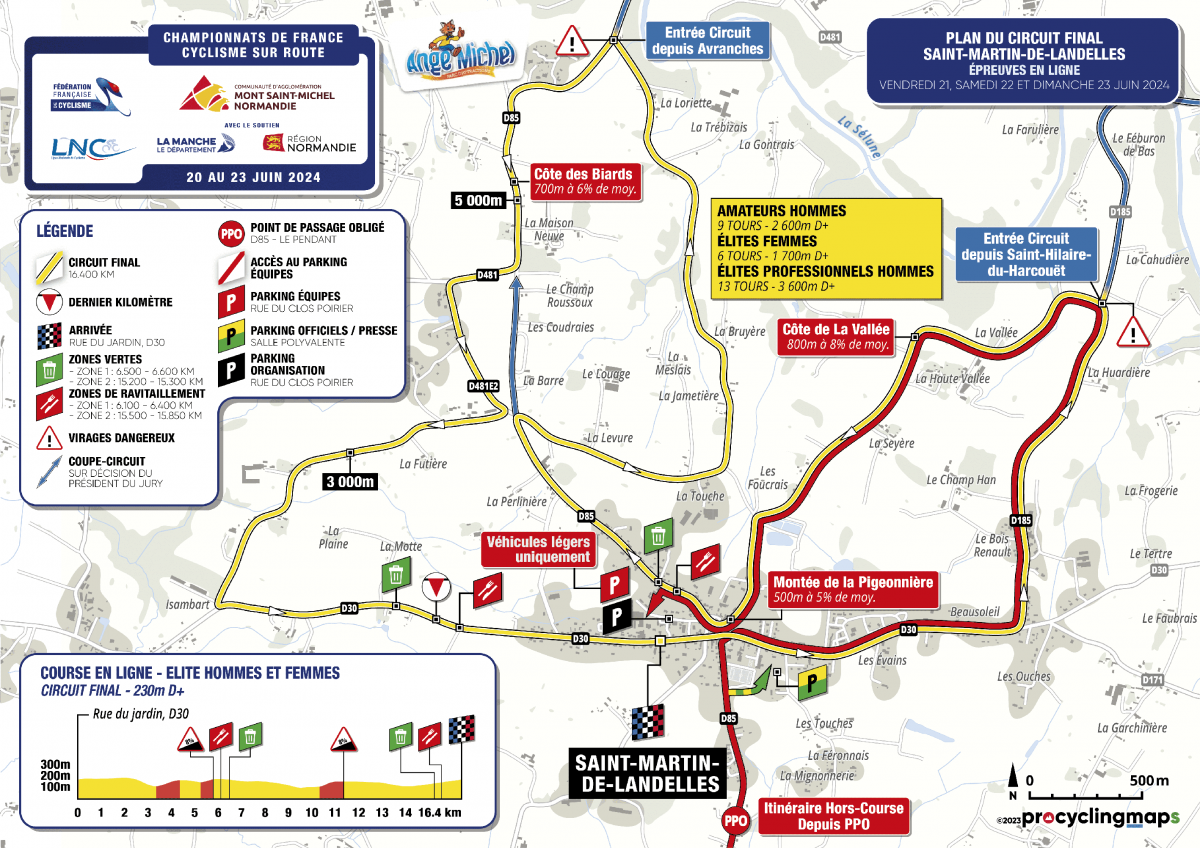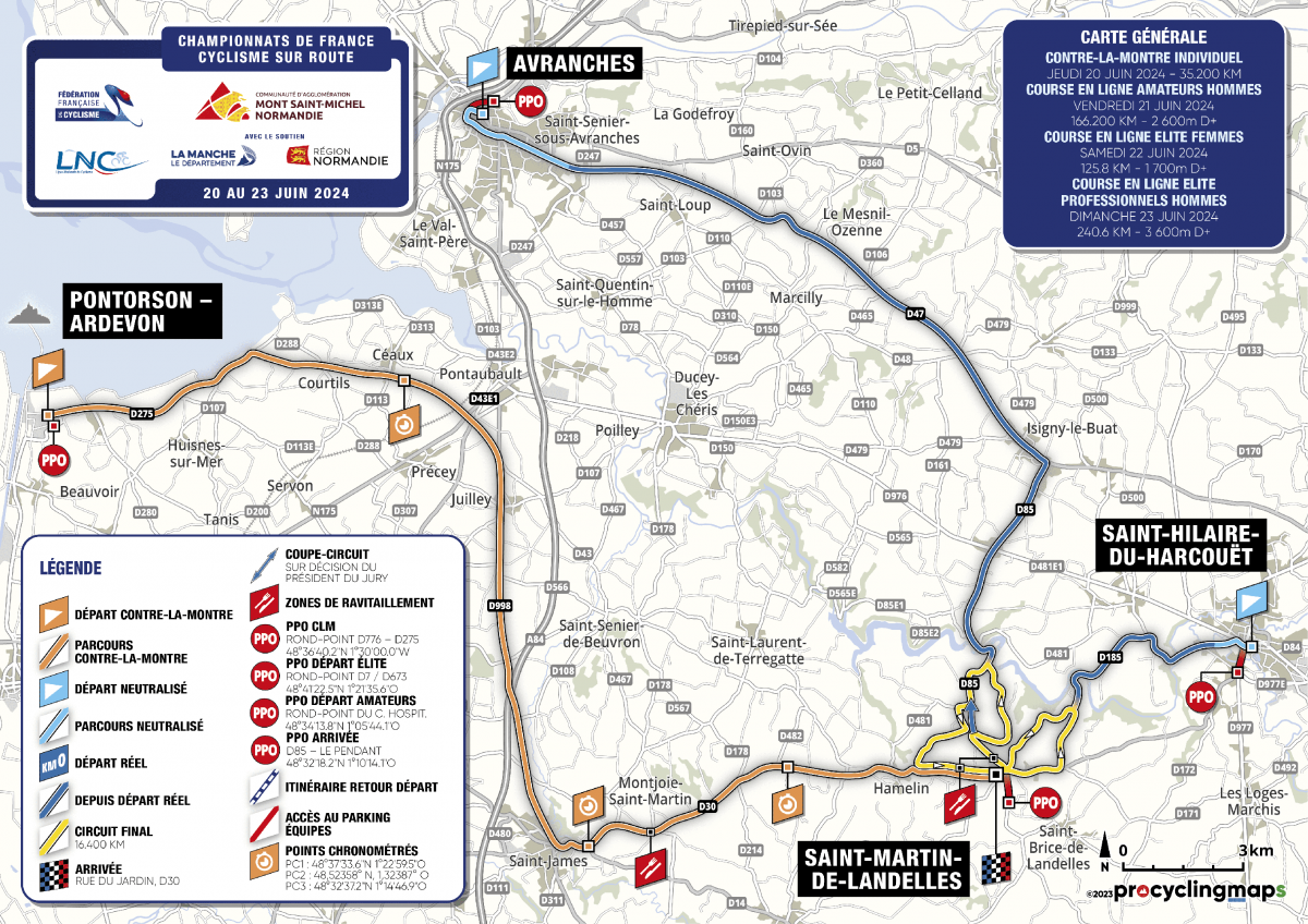 Ce sont 650 cyclistes professionnels et amateurs ainsi que plus de 500 cyclosportifs qui débuteront leur course au départ du Mont Saint-Michel, d’Avranches, et de Saint-Hilaire-du-Harcouët. Huit titres de champions de France seront en compétition, et pour la première fois celui de championne de France contre-la-montre amateur femme et celui de championne de France course en ligne amateur femme.