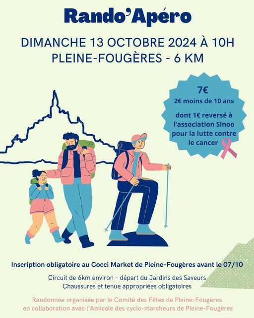 Le dimanche 13 octobre, le Comité des Fêtes de Pleine-Fougères (à 5 km de Pontorson), avec la participation du club des cyclos marcheurs, organise une rando’apéro de 6 kilomètres.