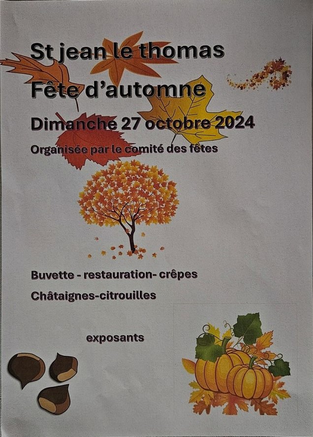 Le Comité des Fête de Saint-Jean-le-Thomas organise sa traditionnelle fête d’automne. Au programme : marché du terroir, vente de citrouilles, châtaignes, compostions florales, buvette et restauration sur place. Une animation musicale accompagnera la fête.