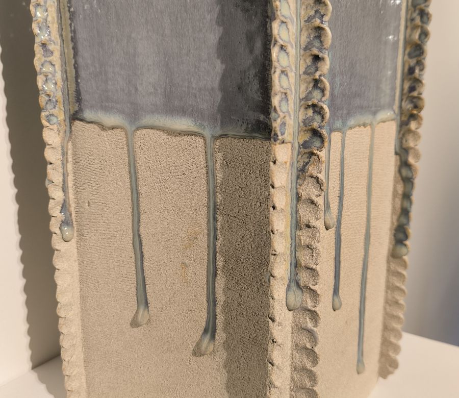 L’exposition s’inspire d’un phénomène bien connu à Ger : la « larme du potier ». Dans les anciens fours à bois, le sel utilisé pendant la cuisson formait une couche vitrifiée sur les parois. Sous l’effet de la chaleur, il arrivait qu’une goutte se détache et tombe sur une pièce. Autrefois considérée comme un défaut, cette coulure est aujourd’hui vue comme une marque du temps et du feu, qui rend la pièce encore plus précieuse.