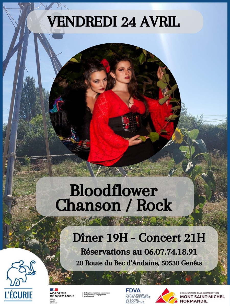 Dîner-concert avec Bloodflower, chanson-rock. Dîner à partir de 19h et concert à 21h.