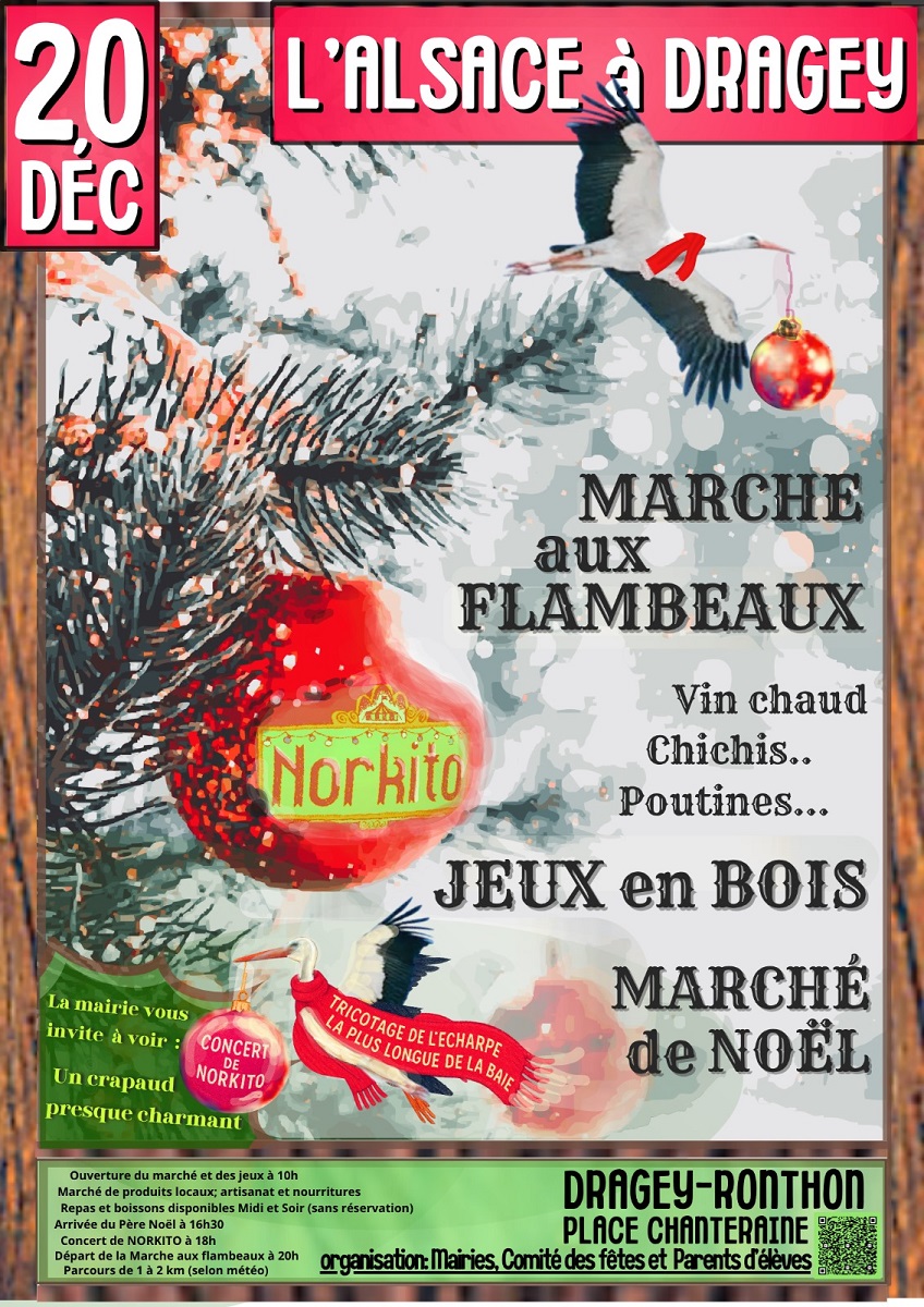 Au programme : marché de Noël, jeux en bois géants intergénérationnels, concours de tricot, arrivée du Père-Noël (à 16h30), concert de Norkito (à 18h), marche aux flambeaux (à 20h), restauration sur place (midi et soir sans réservation).