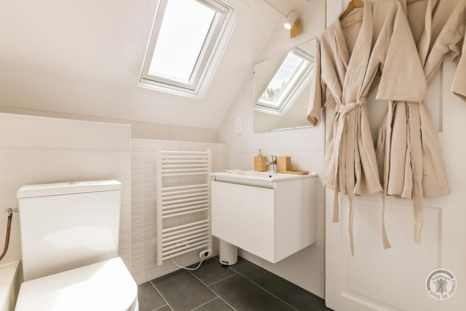 Maison mitoyenne à une habitation. Séjour (TV, internet) avec cuisine équipée ouverte sur séjour (four, plaques induction, micro-ondes, lave-vaisselle, réfrigérateur avec congélateur). wc indépendant. Débarras avec lave-linge. A l'étage, chambre 1 (1 lit 160X200) avec salle d'eau et wc privés. Chambre 2 (2 lits 90X200 jumelables) avec salle d'eau et wc privés. Équipement bébé sur demande. Chauffage électrique en supplément. Draps et linge de toilettes et peignoirs fournis. Lits faits à l'arrivée. Service ménage en supplément. Jardinet clos privé. Salon de jardin. Barbecue. Terrasse privée et close avec salon de jardin, parasol et transats. Le reste du terrain paysagé est clos et commun. Parking privé.