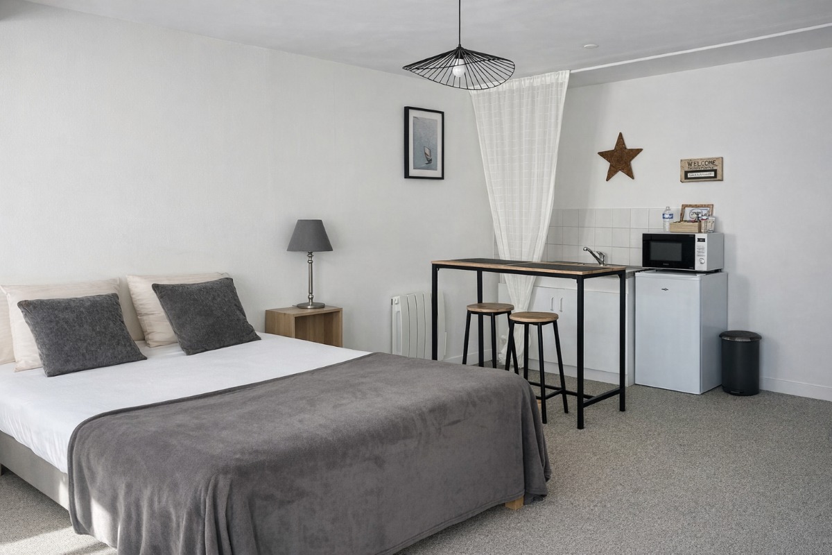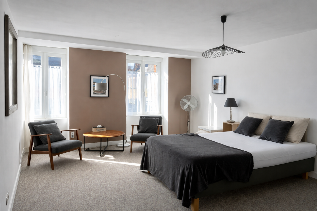 Cette chambre double de 25 m² offre de beaux volumes, une literie confortable et une décoration élégante mêlant charme de l’ancien et touches contemporaines. Elle dispose d’un espace salon-détente, d’un coin cuisinette et d’une salle d’eau privée avec douche et WC. Équipements inclus : lit 140×200, Wi-Fi, machine Nespresso, bouilloire avec thés et infusions, sèche-cheveux et linge de toilette de qualité. Idéale pour un séjour confortable et reposant.