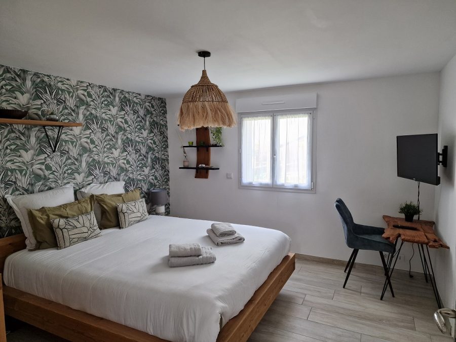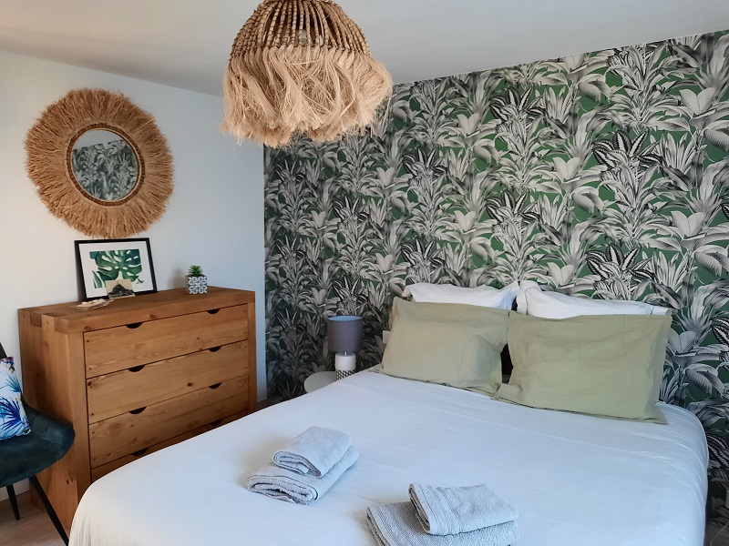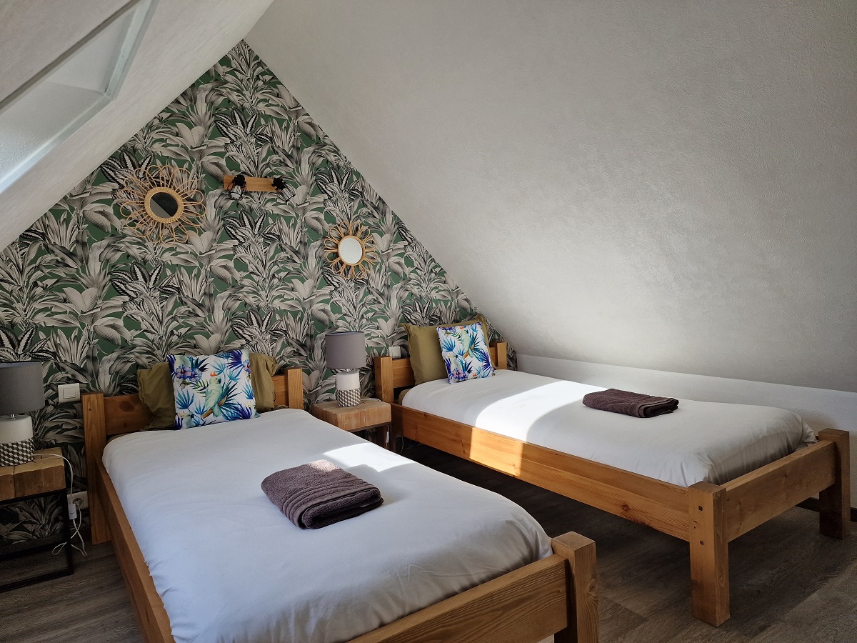 Gîte de 54m², dans un grand jardin qui a vue sur le Mont Saint-Michel. Séjour avec cuisine équipée. Chambre au rez-de-chaussée (lit double), rangements et télévision. Salle d'eau privative avec douche à l'italienne attenante à la chambre. Mezzanine à l'étage avec 2 lits simples, jumelables, commode et dégagement coin jeux et lecture. WC indépendant sur les 2 niveaux.