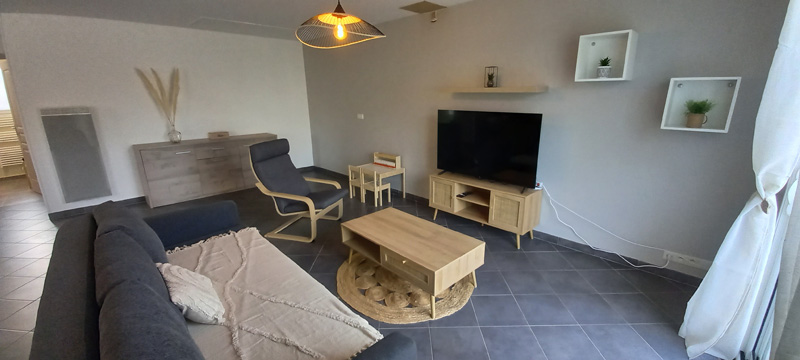 Le gîte est de plain-pied, il se compose d'une grande pièce à vivre avec cuisine ouverte, aménagée équipée, salle à manger et salon avec un canapé lit confort (140x190cm)