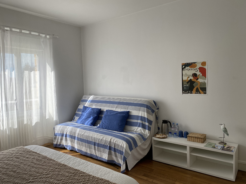 A spacious, bright room for two with en suite bathroom in a quiet street in downtown Avranches. Ideally located for walking to shops and restaurants, as well as the Jardin des Plantes with its view of Mont Saint-Michel.