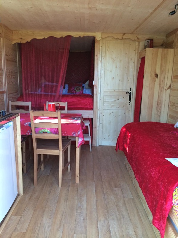Looking for an original vacation on a farm, for two or a family? Our fully-equipped gipsy caravan sleeps 4 (2 adults and 2 children) or 3 adults, with electric heating, 1 alcove bed for 2, 1 pull-out sofa bed, bathroom (shower, washbasin, dry toilet), kitchenette with crockery for 4, fridge, 2 gas hotplates, microwave.