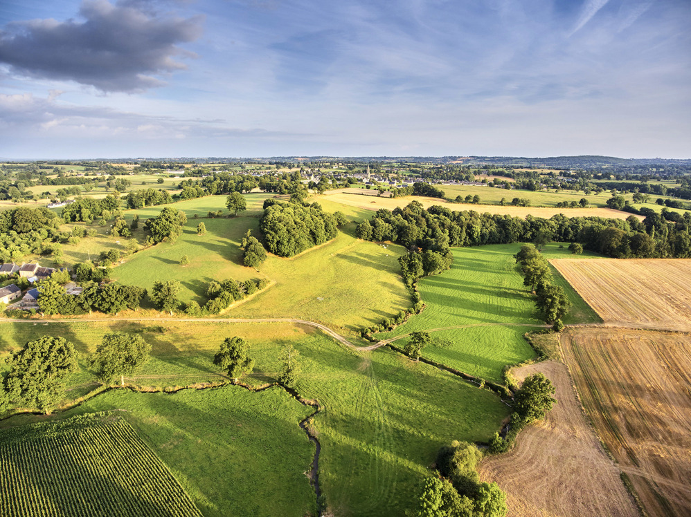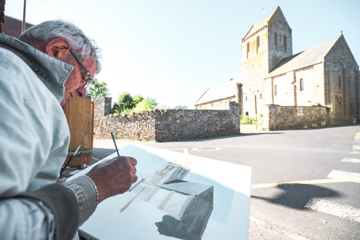¿Por qué ir a Chaulieu, me dices, mi pequeña dama? Pero porque es el punto más alto del Canal de la Mancha con sus 368 m de altitud y porque su torre de madera me ofrece una increíble panorámica de la campiña circundante. Los 360° de esta vista me permiten crear varios tipos de pinturas: el pueblo con su iglesia y los tejados de pizarra de sus casas, o el típico bocage de Normandía con sus tierras de labranza cubiertas de setos que dan un ritmo natural y enmarcado al trabajo que hago.