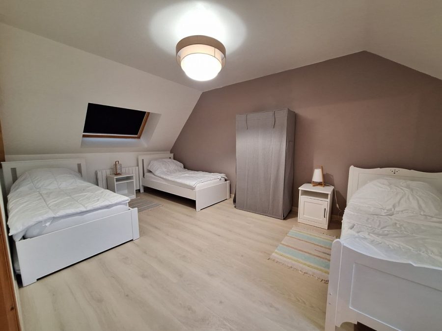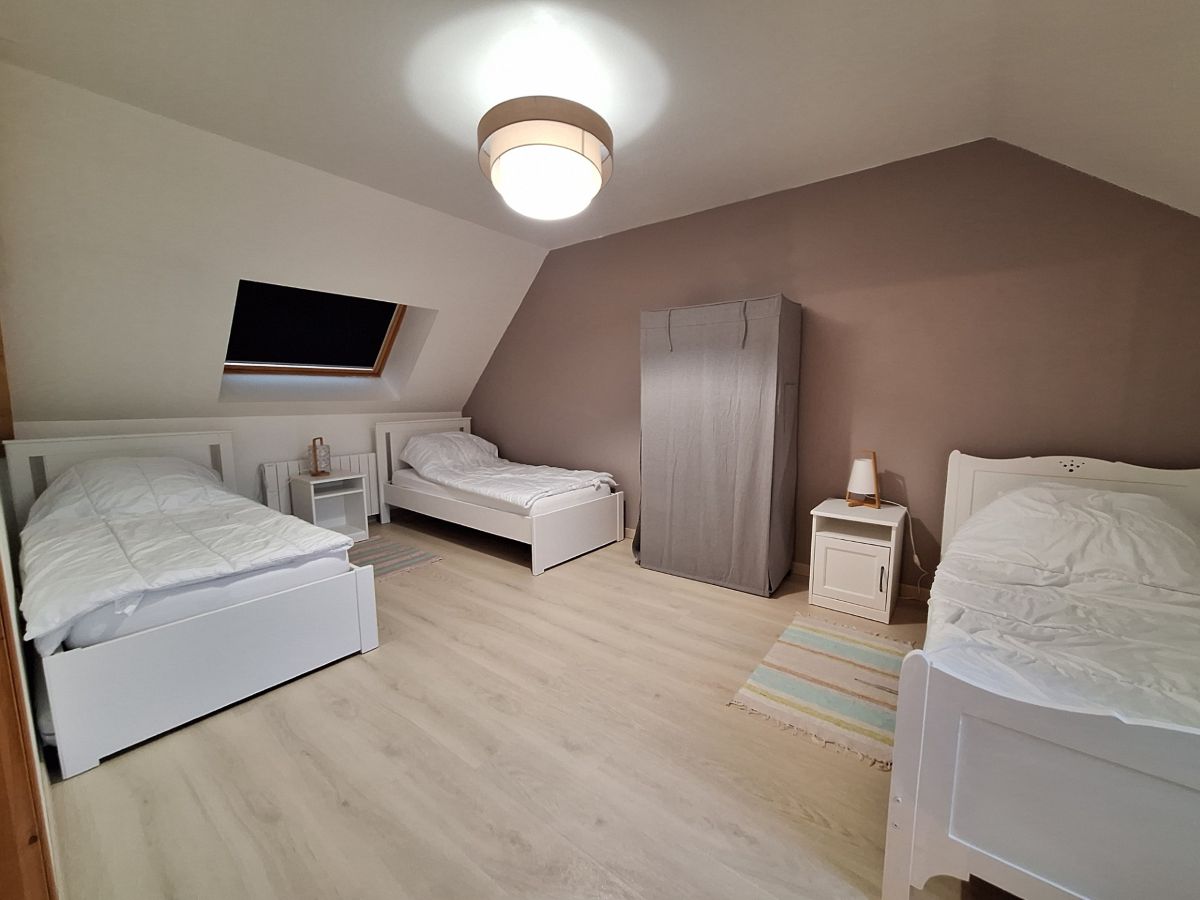 Planta baja: gran salón con sofá cama. Cocina equipada. Ducha italiana, WC suspendido. Primera planta: 3 habitaciones, cuarto de baño con bañera, WC separado.