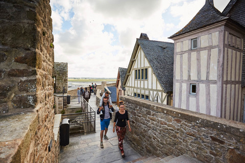 En la Edad Media el peñasco llegó a tener 400 habitantes y más de mil personas vivían allí durante el período de prisión de la abadía. Durante generaciones, un puñado de familias aún animan la vida de este pueblo medieval protegido por sus murallas. El Monte Saint-Michel, en medio de la bahía, escenario de las mareas más altas de la Europa continental, recibe cada año a cerca de 2,5 millones de visitantes y peregrinos de todo el mundo.
