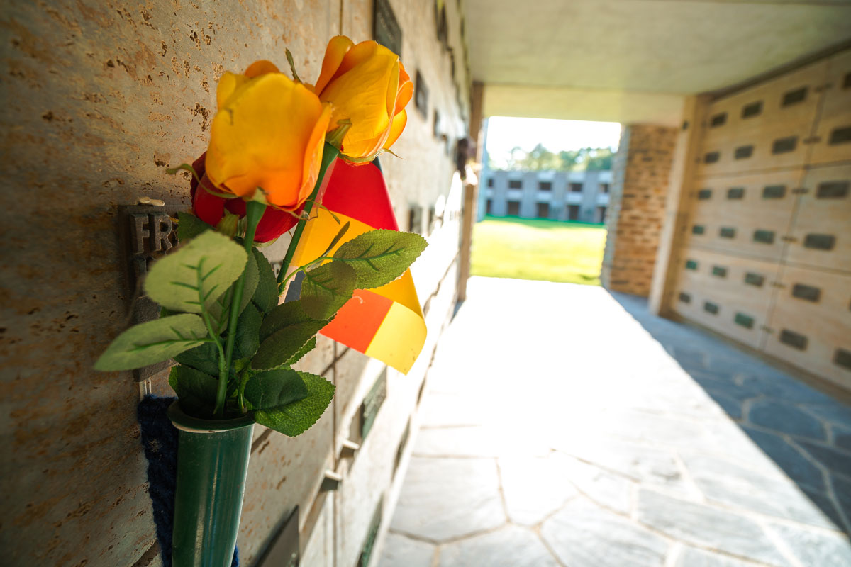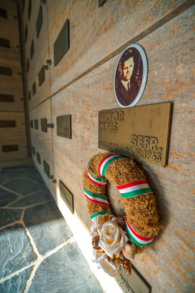 Avant d’entrer dans le bâtiment, une suite de dalles dans les escaliers rappellent le nom des villes, îles, d’où viennent ceux qui reposent désormais ici. Dans le hall d’entrée, une dalle de marbre précise qu’ici reposent également 58 morts inconnus de la Seconde Guerre Mondiale.