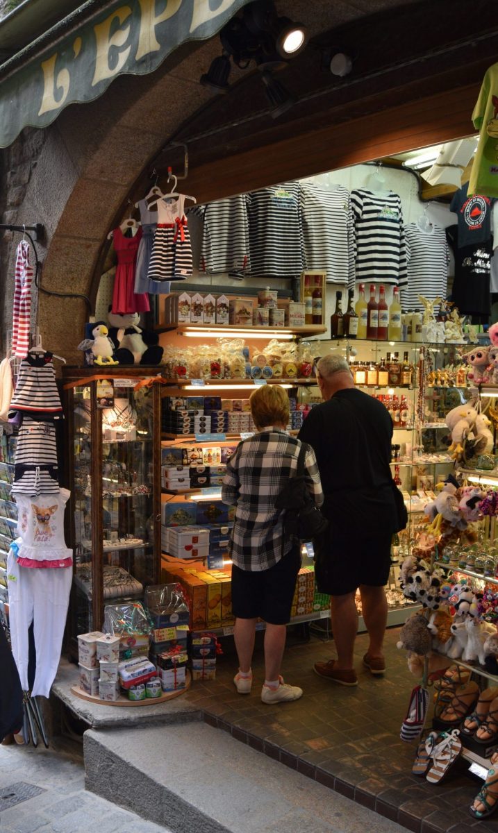 Avec les premiers pèlerins, des boutiques de bibelots s’installent dans le village. Dans ces petites échoppes, chacun pouvait acheter des plombs de pèlerinage frappés de la coquille ou représentant saint Michel. Aujourd’hui, les boutiquiers maintiennent cette tradition du Moyen Âge et sont au service des pèlerins et voyageurs du monde entier en quête d’un souvenir de leur passage.