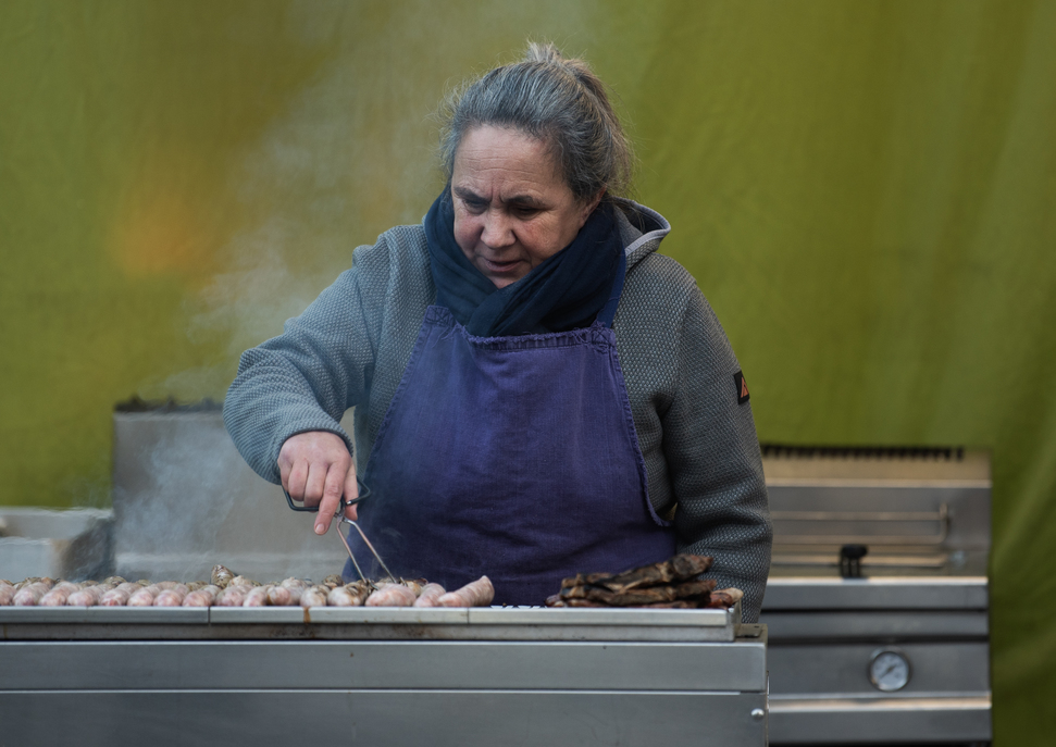 - L’ouïe d’abord, lorsque la pâte vient s’étaler sur la galettière brulante et qu’elle crépite en cuisant ; tandis que la saucisse de son côté grésille sur le grill.